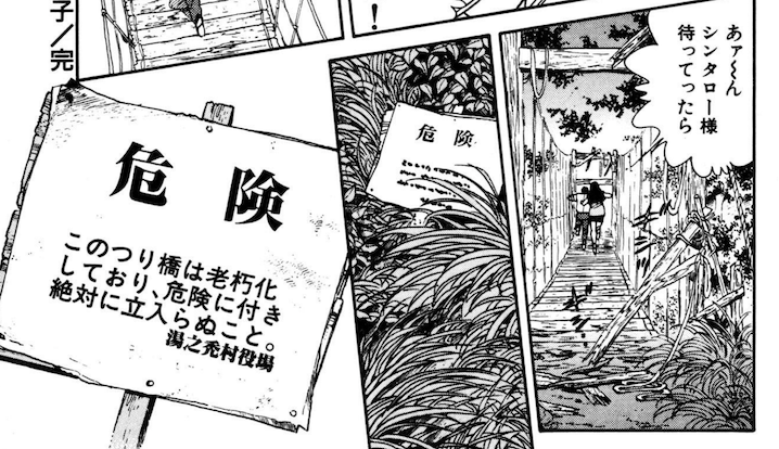 吊り橋の上で二人ではしゃいでいるシーンが描かれてます。